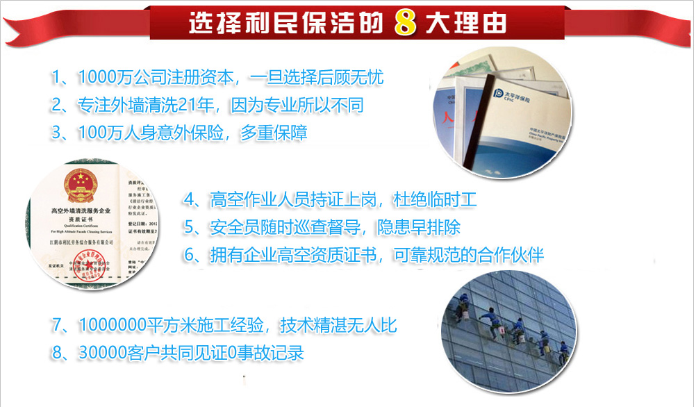 ![]() 利民,高空清潔行業的卓越領跑者。我們的外墻清洗業務包括:外墻清潔、外墻防水補漏、外墻涂料粉刷、LED樓體亮化工程高空安裝、外墻防水工程高空施工等系列高空作業項目,是物業公司、景觀工程公司、廣告公司、建筑、安裝公司、幕墻公司、各企事業單位等最佳高空作業服務專業供應商.專業安全高效,承包高空外墻清洗,.專業的施工團隊,所有人員均持證上崗,高空人員均購買100萬保險,21年1000000平方的外墻清洗經驗,優質的服務..[詳細] 經典案例更多 >